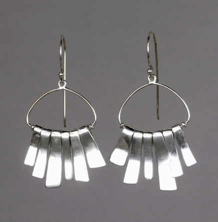 A newcomer to the gallery, Anni Maliki's sensibility is bold, cohesive, and beautiful. Pieces swing freely, producing a changing, vibrant effect. About 2" tall, all Sterling silver.