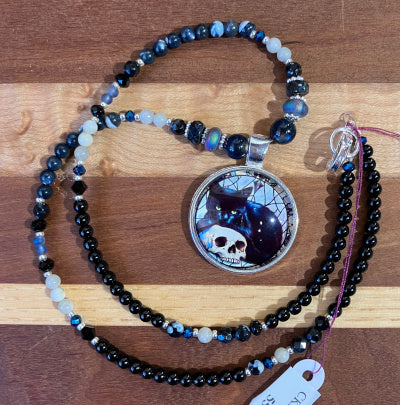 Black cat and skull pendant necklace with black, blue and cream bead accents. Lobster claw clasp. Measures about 21" in length.