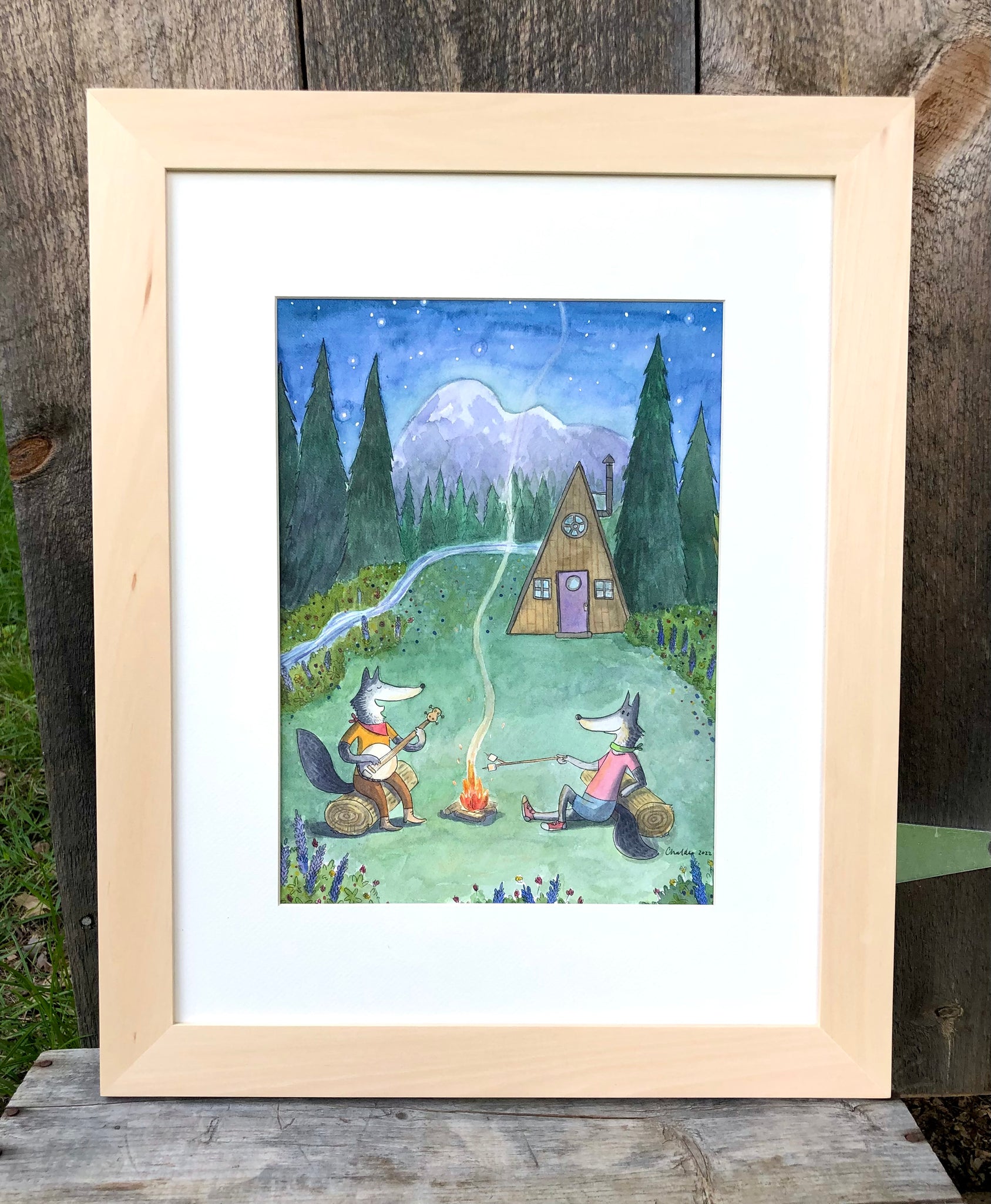 A nice night for some music by the camp fire at the Wolve's Cabin. Original watercolor painting, matted and framed. Measures 16.5" x 20.5".