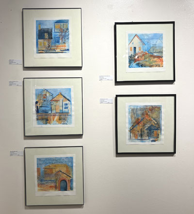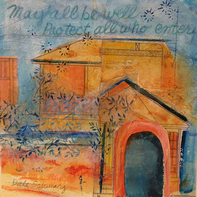 Original painting/mixed media collage using architectural blueprints as a base. Mounted and framed. Outer frame dimension measures 12" x 12".