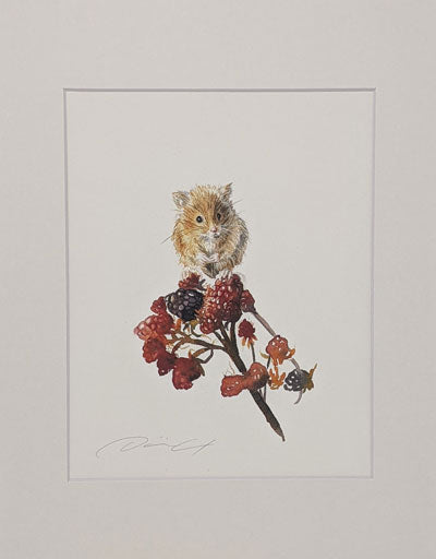A reproduction print of Dani Antes' Harvest Mouse with Blackberries original watercolor. Outer mat dimenstions 11" x 14" and ready to be popped into a frame.