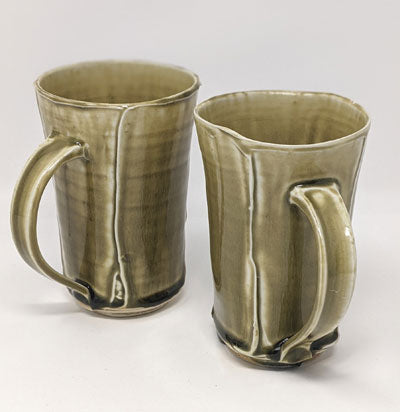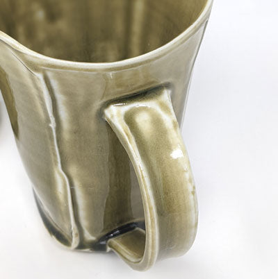 Daniel Bellow's glazes are always so wonderful and layered, and they really makes these everyday pieces something special. This tall mug is about 5" tall and about 3 3/8" wide at the top. Comfortable handle.