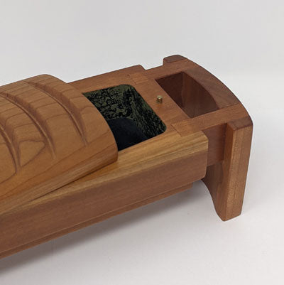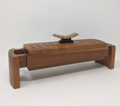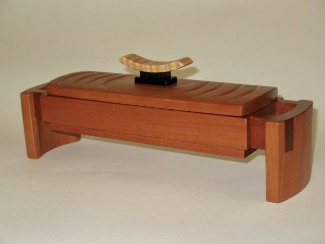 Edward Jacob's woodwork is meticulous- every edge, every corner, every joint. These boxes are clearly made with skill and love, and are heirloom quality pieces that will last. This box is made of Cherry, Tiger Maple, Wenge, and acrylic paint. 11" x 4" x 4 1/2".