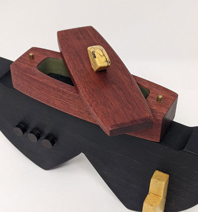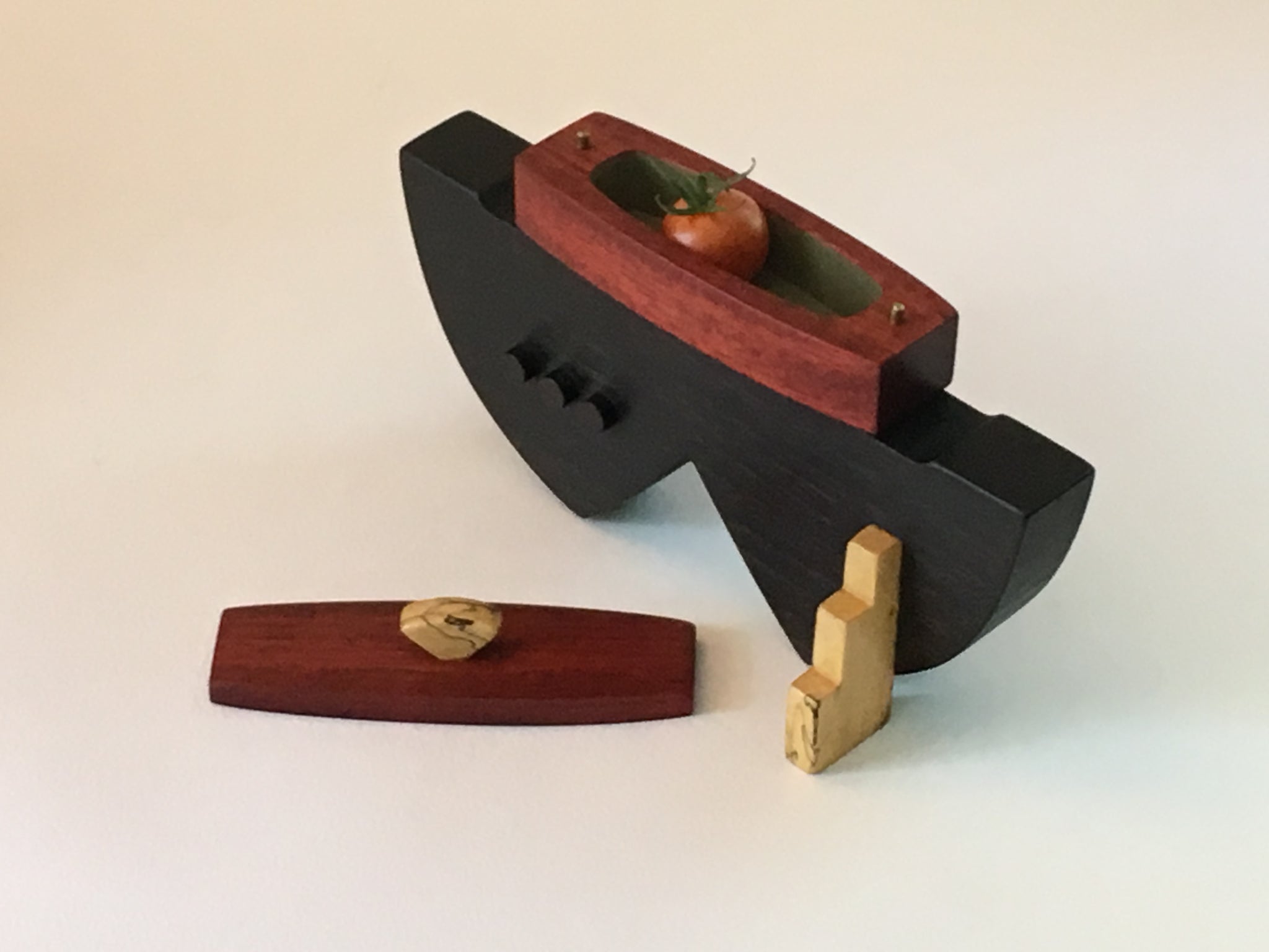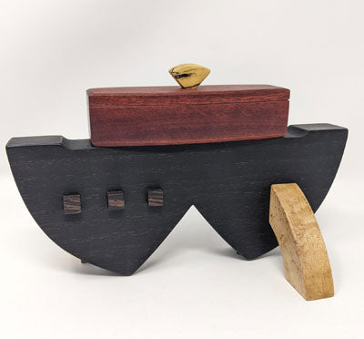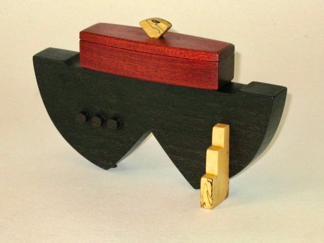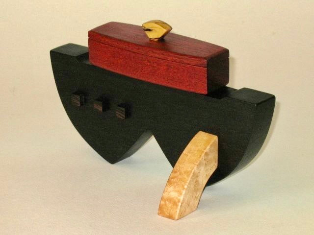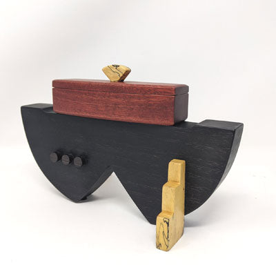 Edward Jacob's woodwork is meticulous- every edge, every corner, every joint. These boxes are clearly made with skill and love, and are heirloom quality pieces that will last. This box is made of Spalted Maple, Bloodwood, Wenge, and Birdseye Maple. 8 1/2" x 4" x 5 1/2".