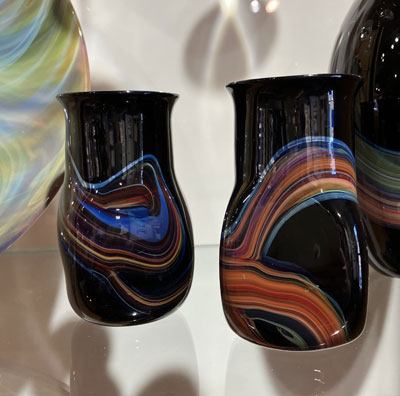 This unique handmade tumbler is made of deep amethyst glass and silver reactive glass, creating the classic Simpson Blue New Mexico patterning. Tumbler is stable and comfortable in the hand, and measures about 4 1/2" tall, heights vary. The gallery will choose your tumbler from those available. Please hand wash, not for use with very hot liquids.