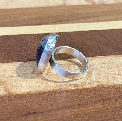 Homestone Jewelry & Designs mines, grinds and polishes stones found in the Northeast and fuses them with wood and metal smithing to bring you truly unique one of a kind work, like this statement ring in Sterling silver. Ring size 6.5.