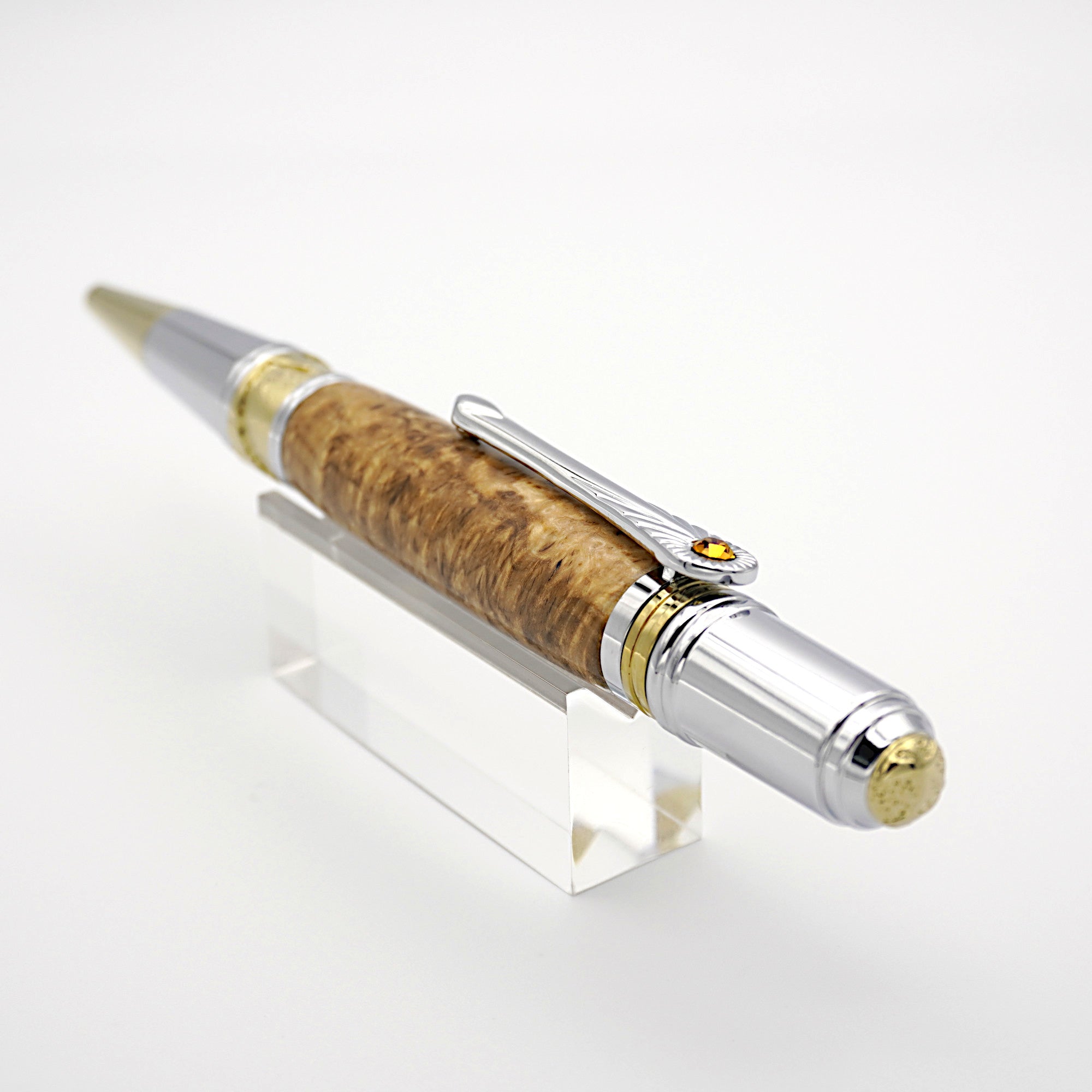 A twist-style ballpoint pen featuring fittings designed by accomplished pen designer David Broadwell. Custom casted 3-D Art Deco design components and premium plating on all exposed accent rings, bands, and caps really bring this pen to life. The Black Ash burl comes from northern swapy woodlands and is fairly rare, as they are difficult to locate and harvest.