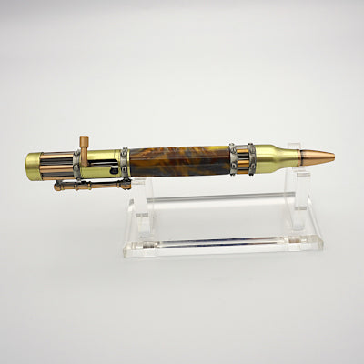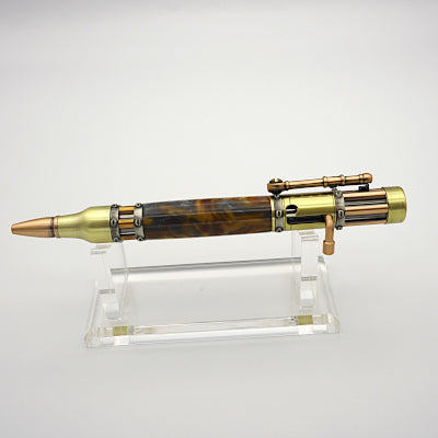 Steampunk is a sub-genre of science fiction that incorporates modern technology and aesthetic designs inspired by 19th-century industrial steam-powered machinery. This pen features a swirling molten metal resin barrel with antique brass & antique copper fittings and a bolt-action mechanism.
