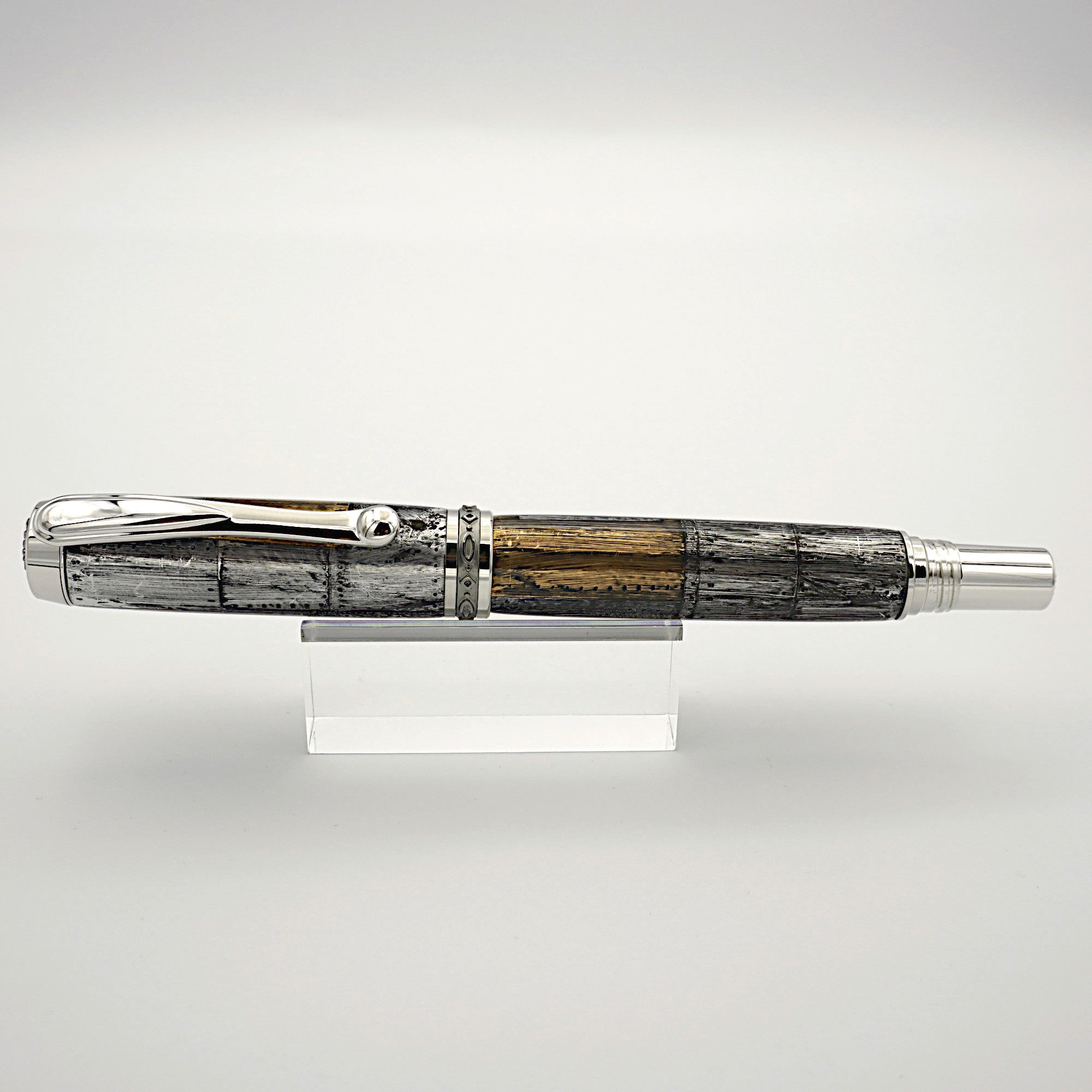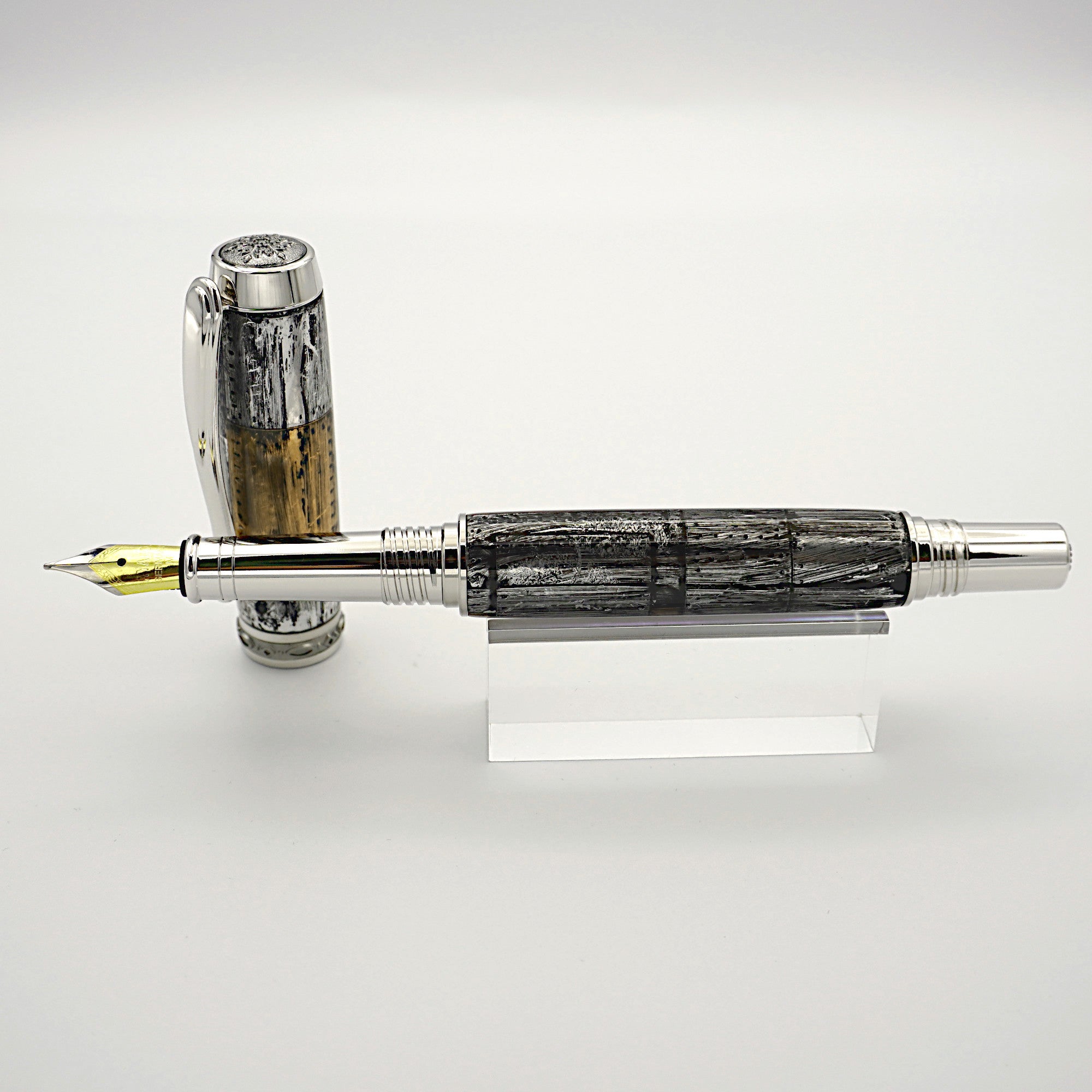 This Steampunk style pen consists of pieces of silver and copper colored metal encased in acrylic. Components are plated with rhodium and black titainium and a detailed center band. Includes a premium refillable ink pump and a medium #5 nib installed. Screw cap.