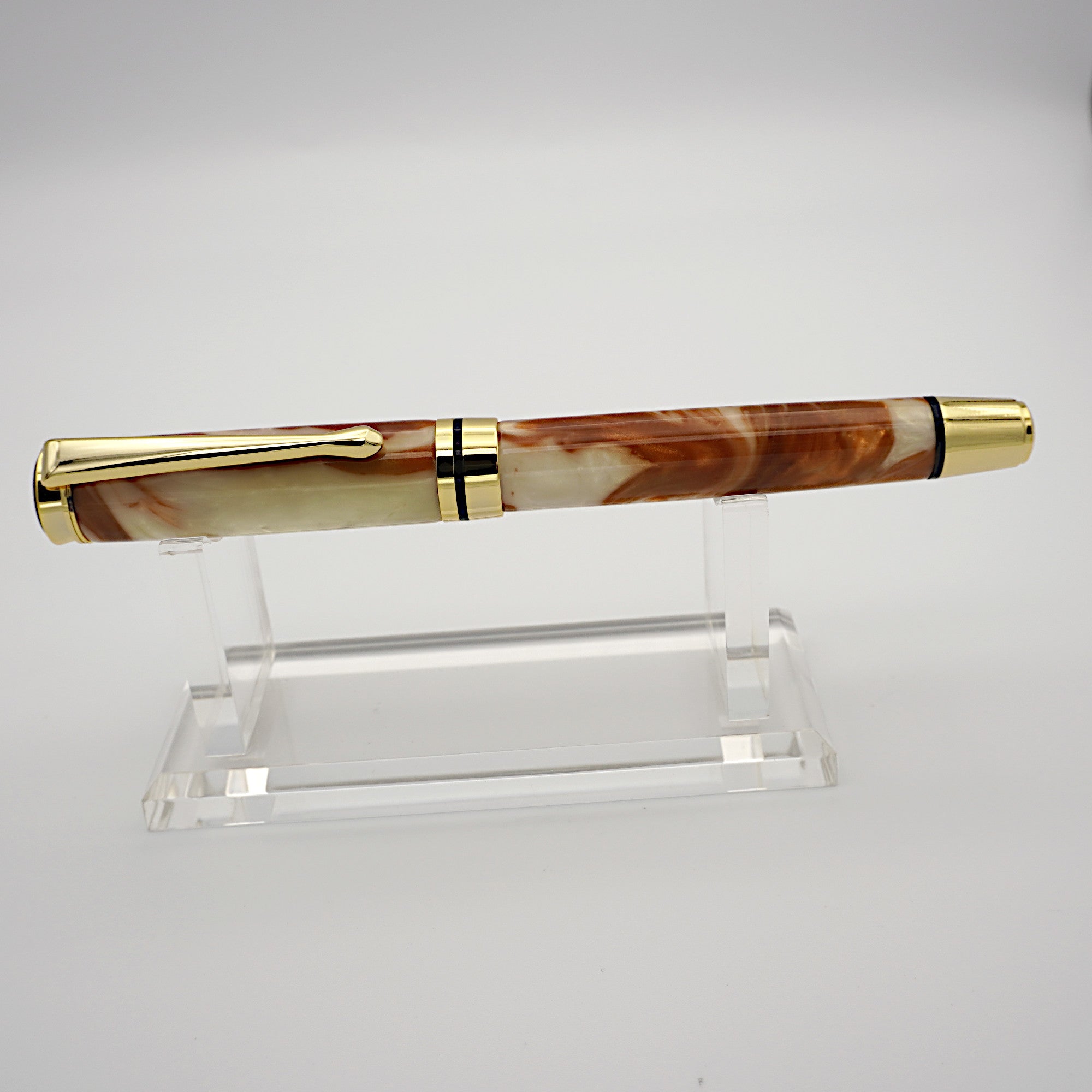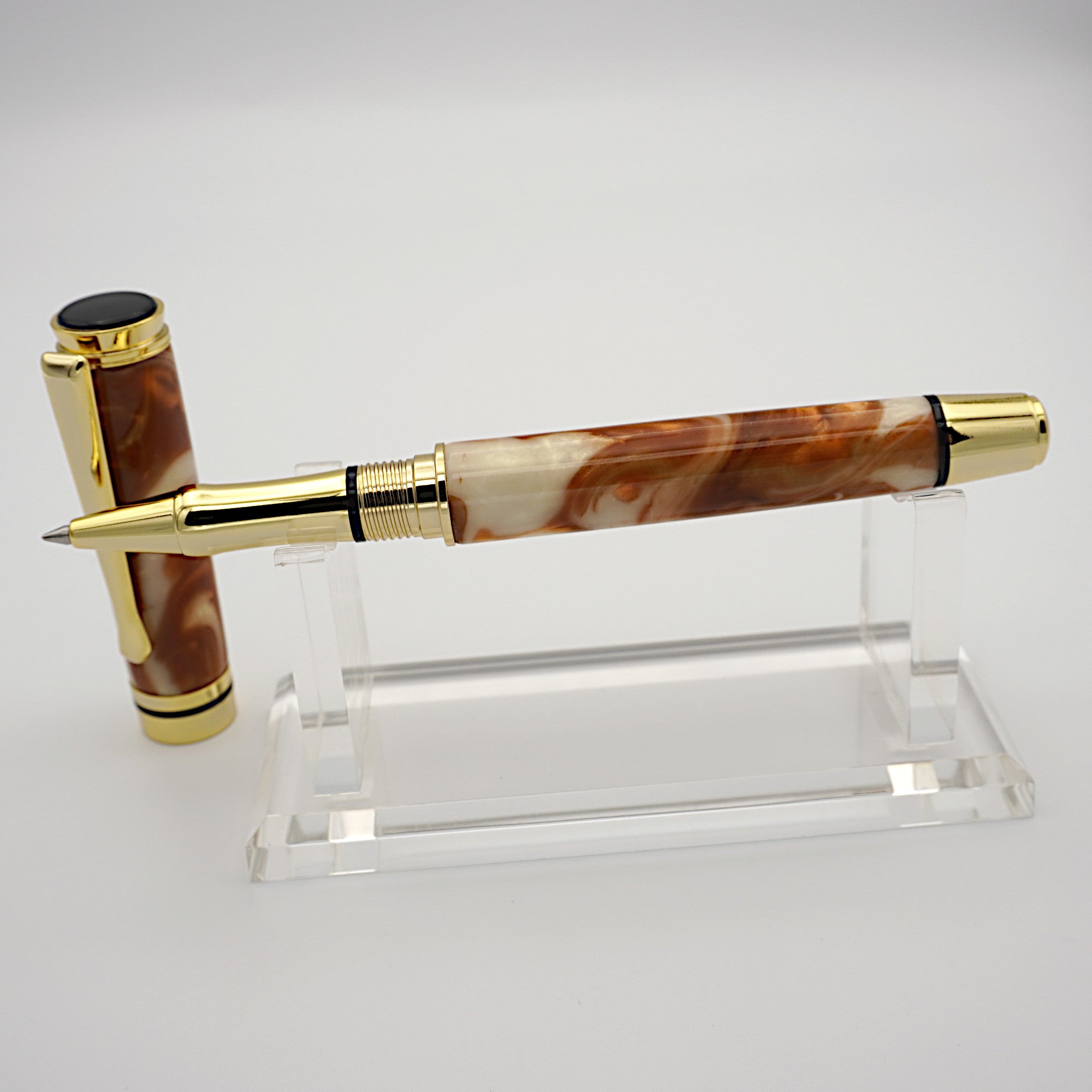 This pen has swirls of metalic copper lightning and cream acrylic with quality gold and black metal parts manufactured in England. Refillable rollerball style with screw cap. Comes in a black leatherette gift box.
