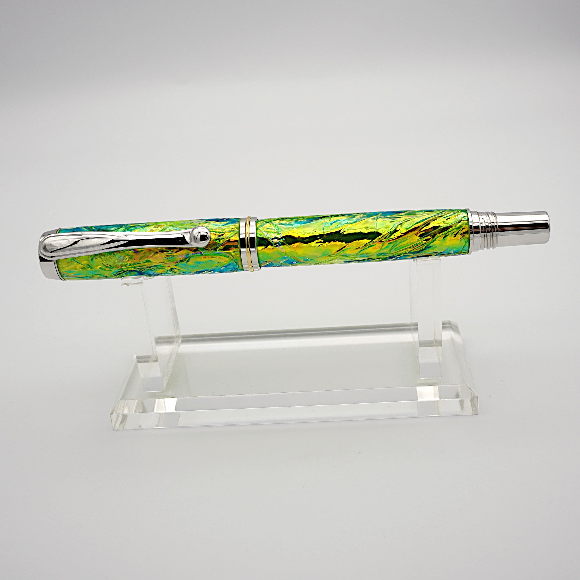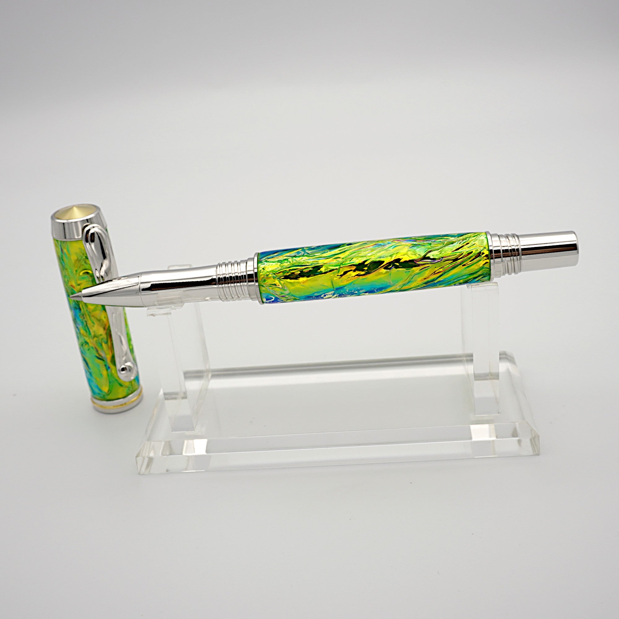This pen is made using Dragon Opal FX acrylic and shimmers with a reflective fire that seems to emanate from within. Refillable rollerball style with screw cap and rhodium and gold accents. Comes in a black leatherette gift box.