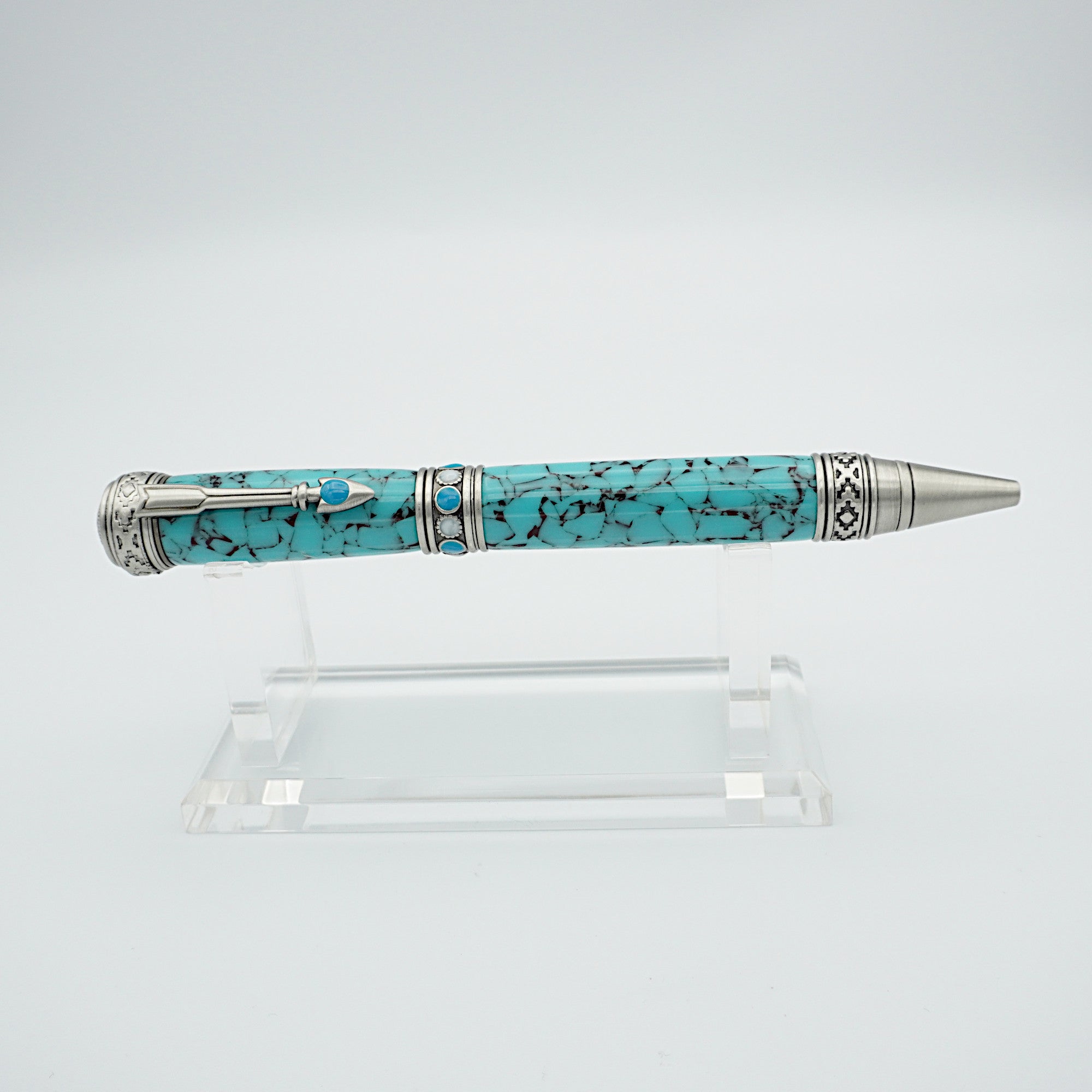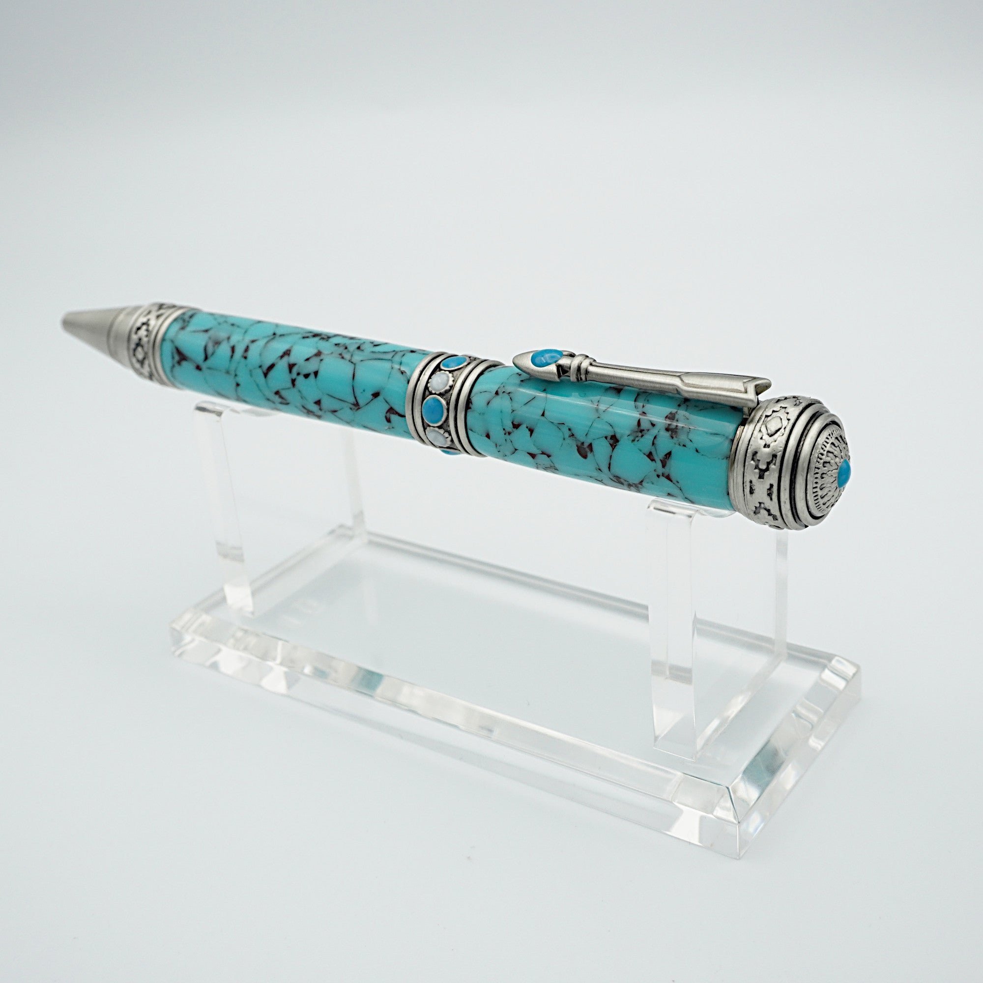 This twist-style ballpoint pen features a Desert Mesa flower on the top - an earthy, elegantly stylized circular motif with concentricrows of antiqued beads and twisted rope, accentuated with an acrylic turquiose cabachone in the center. The pen end and nib bands feature geometric shapes inspired by weaving patterns of the Southwestern American Indians, and the stylized arrowhead clip is a symbol denoting protection.
