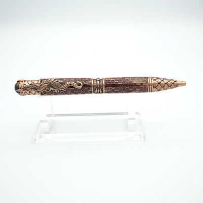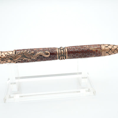 A beautifully sculpted dragon pen with a honeycomb resin body and rose copper accents.