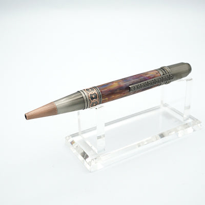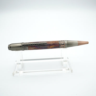 Combining design with function, this pen features two-tone plating with distinctive Art Deco styling. Rose Copper and Gunmetal accents with a sparkling barrel of maroon, plum, blue and gold.