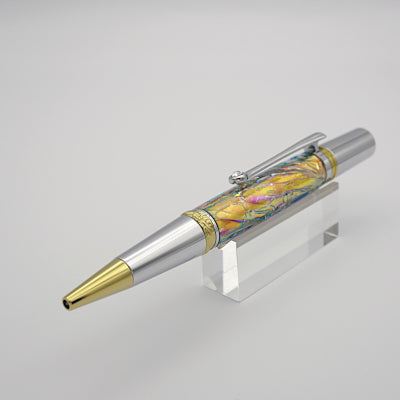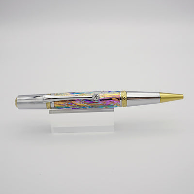 This pen has an ice blue shimmer with strong flashes of golds, oranges and pinks. Decorative center band, tip and top are gold titanium and chrome, with a Swarovski crystal accent on the clip.