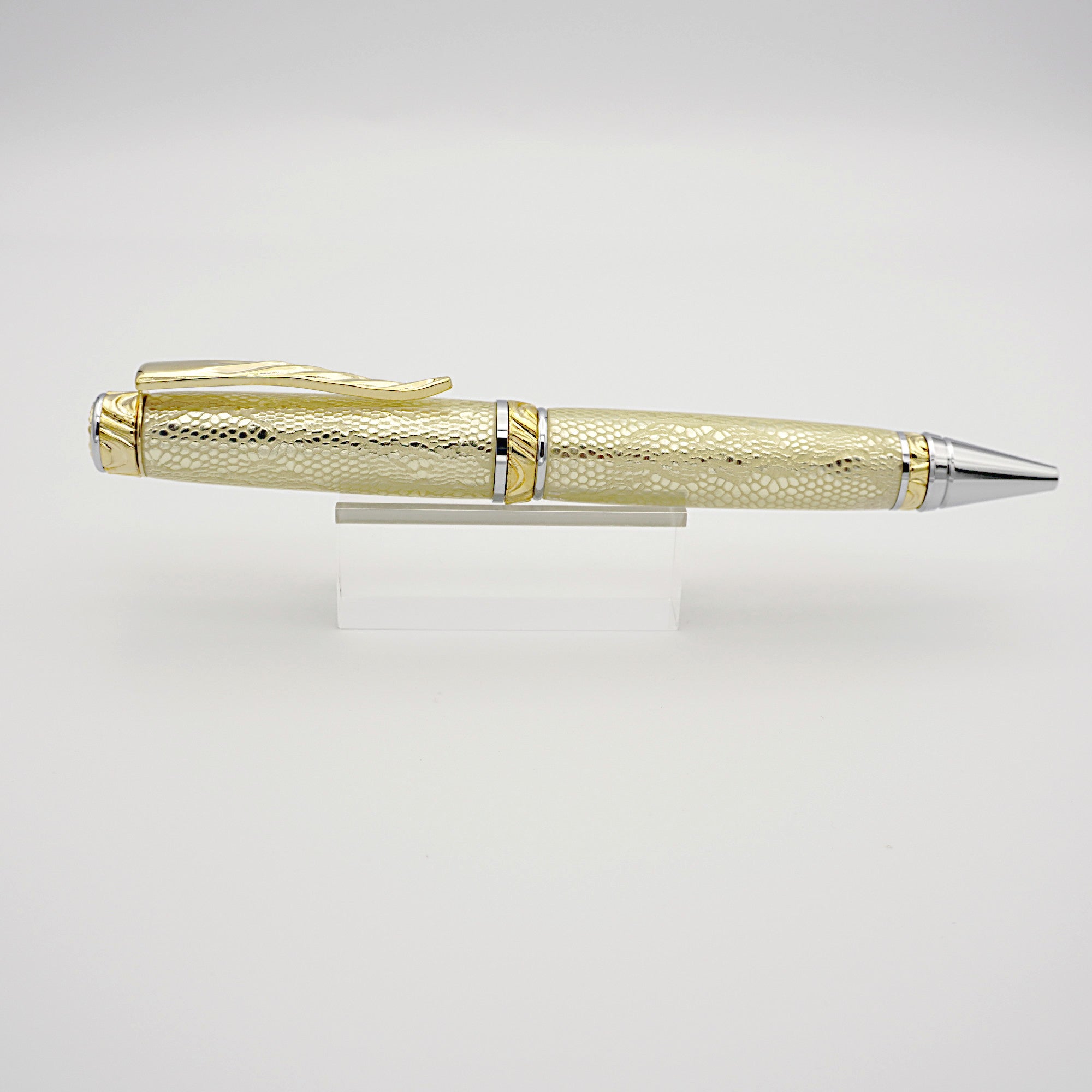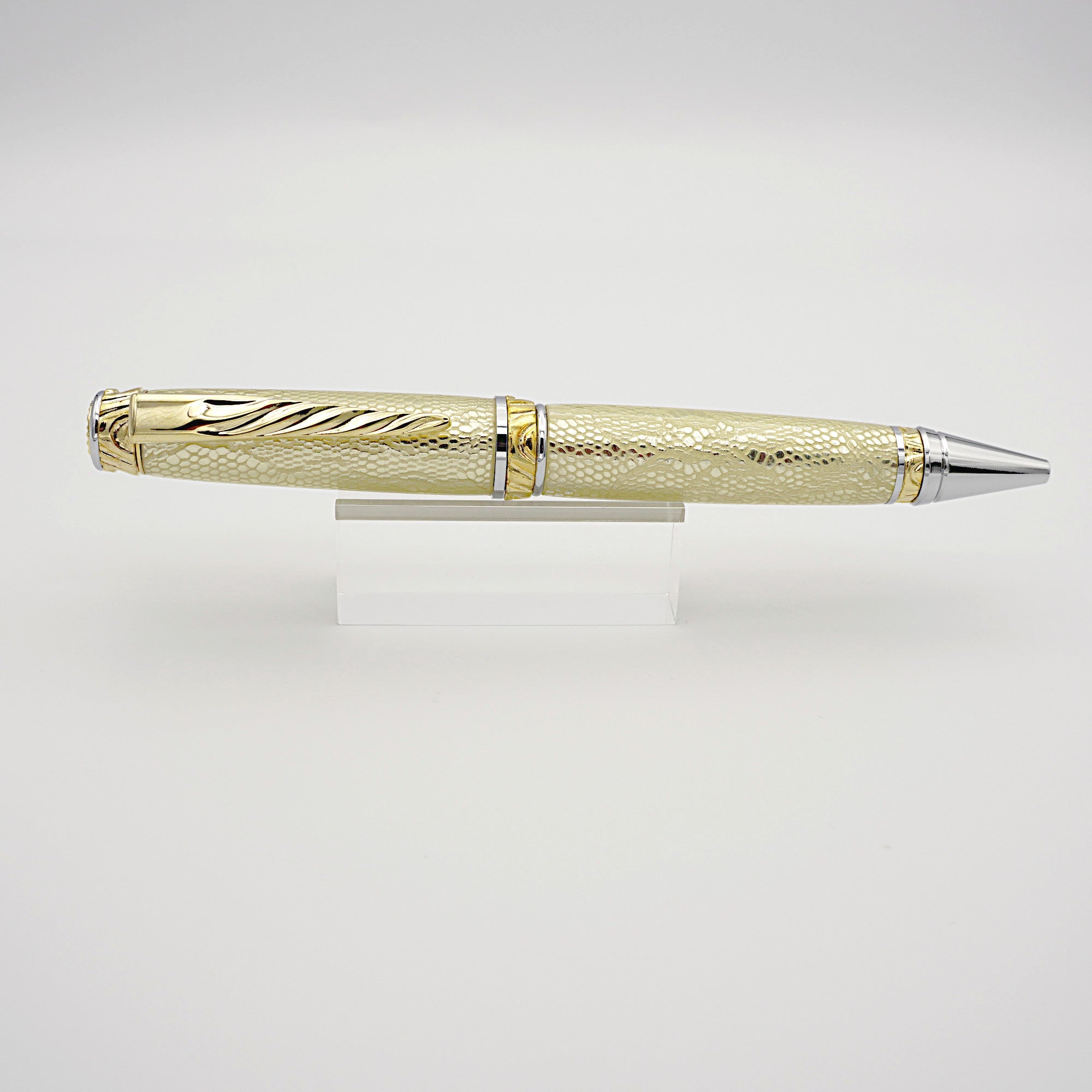 This pen features a clear acrylic cover cast on top of a striking gold on white patterned leather wrapping. Replacable cartridge uses Parker style refill. Comes in a black leatherette gift box.