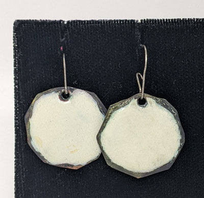 These oxidized sterling silver earrings are fused with opaque enamel colors and hand burnished for a matte finish. About 1" across.