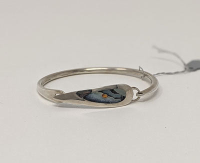 Jacqueline DeBoer uses a cloisonne technique to create miniature fine enamel landscapes and florals, set in Sterling silver. This landscape features a tiny 24k gold sun. Inner dimensions 2 1/4" x 1 3/4", fits a tiny wrist.