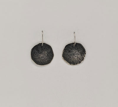 Jacqueline heavily worked these Sterling silver discs then added a patina for depth. About 1 1/4" tall from top to bottom.