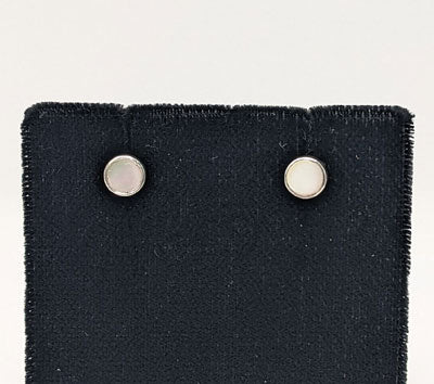 Sweet little studs from Jeanne! Mother of Pearl set in Sterling silver with 14k posts. About 1/4" across.
