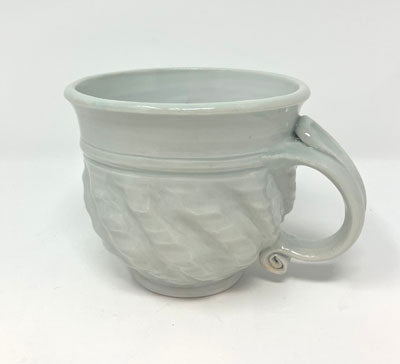 John's porcelain pieces are a delight to behold, with beautiful glaze and texture combinations. This mug is about 4" tall.