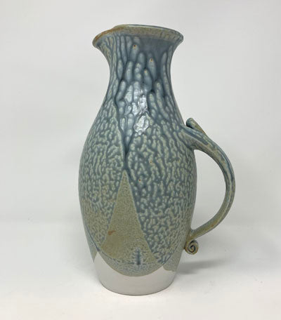 John's porcelain pieces are a delight to behold, with beautiful glaze and texture combinations. This pitcher is about 9" tall.