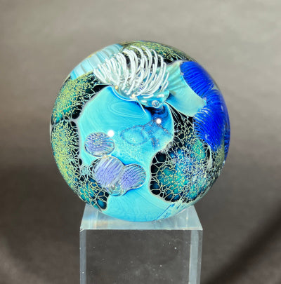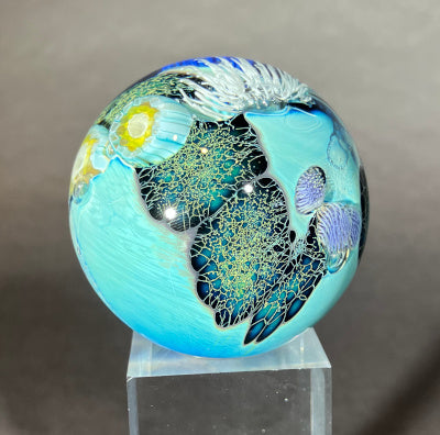 This 1 3/4" Planet is round and sits nestled and ready for display in a brass globe stand.