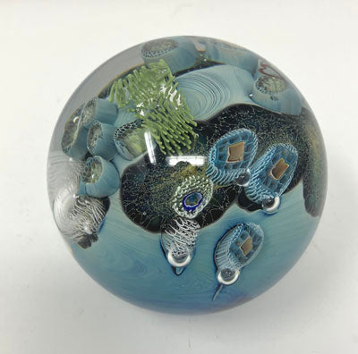 Every year for Valentine's Josh Simpson makes planets that contain this very special 'heartfelt' cane. Each Blue New Mexico planet hosts a few of these hearts, all a little different, all unique. 3" wide planet with a flat, polished bottom. Signed and dated by Josh.
