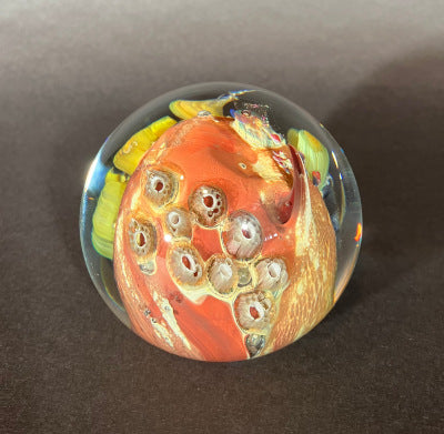 This unique solid glass Planet contains a desert world reminiscent of Mars after its subterranean waters erupted through the dusty crust. Or maybe it's just a planet in some galaxy far far away. Made using handmade, bundled cane and Red New Mexico glass in layers of crystal clear glass.
