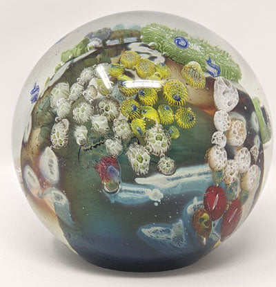 Signed by Josh and numbered 7.2.20. This Megaplanet was made with Josh's signature New Mexico glass, and contains a world full of lush green continents and swirling blue seas marked by the exotic columns and mountains, and a variety of exotic structures that seriously suggest an alien civilization got here before you did. Made using handmade, bundled cane and blue New Mexico glass in layers of crystal clear glass, this 6.5" Inhabited Paperweight has a flattened, polished base.