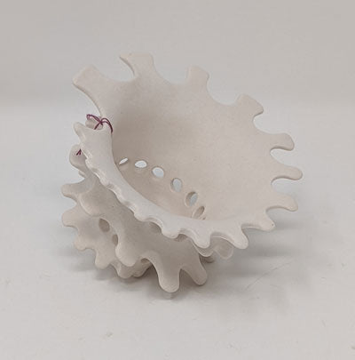Distinctive forms reminiscent of urchins or shells or something from the sea. Unglazed porcelain, about 3 1/2" wide.