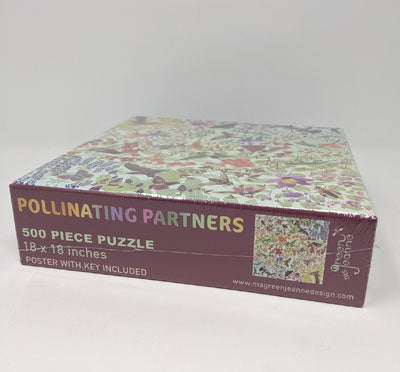 From graphic designer Ms Green Jeanne, a 500 peice puzzle featuring Pollinating Partners. Fun and educational! Finished puzzle 18" x 18".