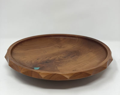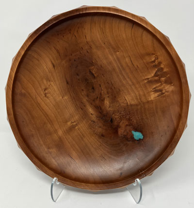 A beautiful Cherry bowl with Turquoise inlay and a scalloped edge. 11" across.