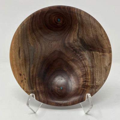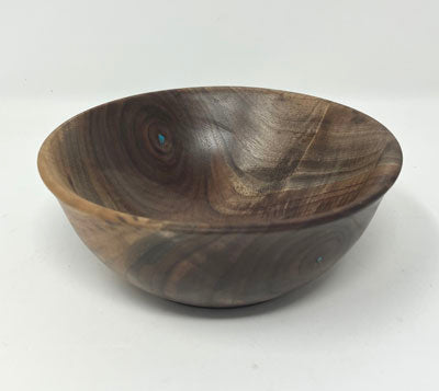 A small Walnut bowl with a touch of Turquoise inlay, about 5" across.