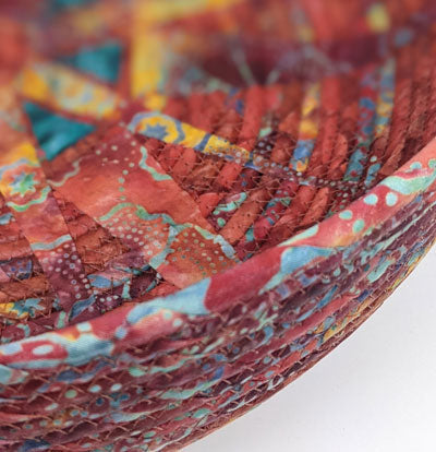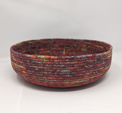 Annie's hand-coiled baskets are made with premium hand-dyed textiles and durable cord. Some surfaces have been buffed to a subtle sheen with a thin veneer of purified, food safe, earth friendly beeswax. This basket is about 12" wide and about 3 3/4" tall.