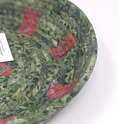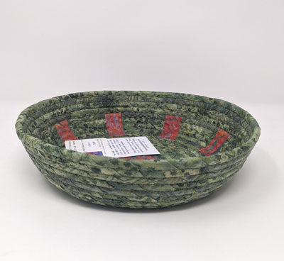 Annie's hand-coiled baskets are made with premium hand-dyed textiles and durable cord. Some surfaces have been buffed to a subtle sheen with a thin veneer of purified, food safe, earth friendly beeswax. This basket is about 8 1/2" wide and about 2" tall.
