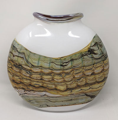 Another beauty from glass duo Gartner Blade, this vase is a stunner. I like to imagine if filled with tall cut Forsythia branches in full bloom! About 10" across, 10" tall, and about 3" wide.