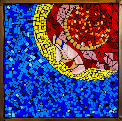 Sam Myers, a mixed media artist originally from England and now based in Western Massachusetts, specializes in mosaics, stained glass, and glass painting. In this exhibit she explores the interplay of color, light, and form at Salmon Falls Gallery.