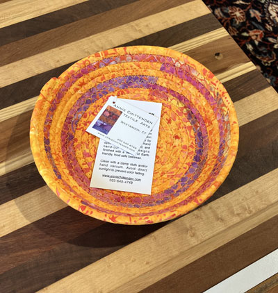 Annie's hand-coiled baskets are made with premium hand-dyed textiles and durable cord. Some surfaces have been buffed to a subtle sheen with a thin veneer of purified, food safe, earth friendly beeswax. This basket is about 6.5" wide and about 1.5" tall.