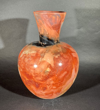 These burnished vessels are thrown using porcelain clay- this very smooth white clay lends itself to the burnishing process. Once the pot is completely dry and before firing in a kiln the pot is polished several times with a smooth stone, this is know as burnishing. The first time the pot is burnished a coat of baby oil is rubbed onto the surface of the pot and polished; this produces a smooth slightly shiny surface. The second burnishing involves the thin application of a clay slip called terra sigillata [which is Latin for Earth Seal]. Once the terra sigillata is applied to the smooth bone dry pot it is burnished a second time with a piece of fleece. A high gloss starts to develop on the surface of the pot. Once the pot is burnished it is bisque fired for strength. The bisque fired porcelain is very white and shiny, but still porous. Each pot is then placed in a saggar or container which is made of bricks or clay. The pot is then carefully surrounded with hard wood chips, kosher salt and clay oxides. The saggar is sealed with the pot inside and fired again to about 1900 degrees Fahrenheit. The next day the pots are unloaded from the saggar cleaned and gently buffed revealing a beautiful surface obtained from the smoke and fumes trapped in the saggar with the porous pottery. This pot is about 12" tall and about 7" across.
